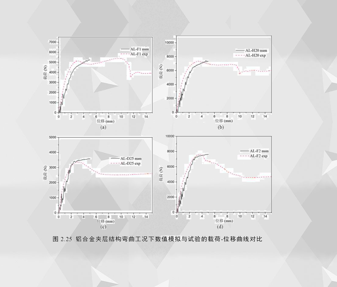 2.25展示了四種試件在彎曲位移0至5mm的數值模擬載荷-位移曲線及其相應的實驗曲線,其中(a)和(b)的臨界失效模式為壓痕壓入(IN),(c)和(d)為芯層剪(CS),圖中曲線均為原始數據,未作濾波處理。