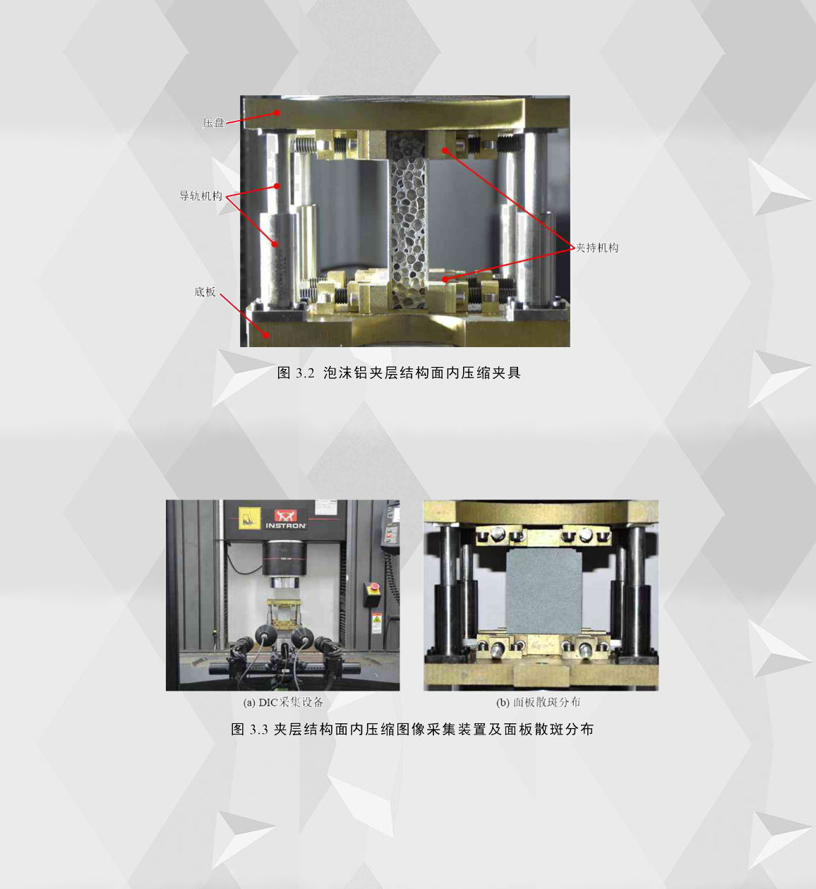 本章泡沫鋁夾層結(jié)構(gòu)面內(nèi)壓縮試驗所用到的實驗加載機器為INSTRON5894萬能試驗機,以恒定壓縮加載速率1mm/min作用在壓盤上。考慮到過大的加載位移可能超出夾層結(jié)構(gòu)的承載能力,對其過大的變形研究意義不大,因此本章分析所有試件的極限加載位移的設(shè)定為5.5mm。為了獲得芯層泡沫鋁的破壞形式和面板的屈曲過程,對其側(cè)面(即圖3.2所示試件位置)進行圖像采集;與此同時,采用數(shù)字圖像相關(guān)技術(shù)(DIC)測量夾層結(jié)構(gòu)面板的變形量,如圖3.3所示(a),根據(jù)DIC技術(shù)采集原理,在開始面內(nèi)壓縮試驗之前需要對夾層結(jié)構(gòu)面板表面噴涂啞光白漆作為底漆,等待底漆晾干之后再噴啞光黑漆,形成可以被DIC采集設(shè)備識別的散斑,面板處理之后散斑分布效果如圖3.3(b)所示。