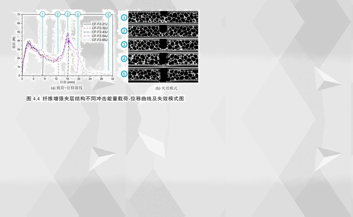 通過分析發(fā)現(xiàn),碳纖維夾層結(jié)構(gòu)和玻璃纖維夾層結(jié)構(gòu)的具備相似的沖擊失效機理,以CF-F2為例,通過其在不同沖擊速度下得到的載荷-位移曲線對比來看,如圖4.4(a)所示,當前速度范圍的應變率對此纖維增強夾層結(jié)構(gòu)的機械響應影響不大,所以亦可以用不同沖擊速度下的試件最終破壞形式來分析其損傷失效機理,這與鋁合金夾層結(jié)構(gòu)的分析方法類似。通過觀察發(fā)現(xiàn),CF-F2的載荷-位移曲線和失效過程與AL-F2有很大地相似性,均存在兩個峰值載荷并且未出現(xiàn)面板與膠層失效分離。與AL-F2不同的是,由于CF-F2面板為脆性材料,其載荷達到第一次峰值載荷的位移要比AL-F2的小許多,并且CF-F2在第一階段的曲線更加接近線性增長;此外,前者在兩峰值載荷下降位置處,面板發(fā)生塑性斷裂,而后者發(fā)生脆性斷裂;由于兩者的第二階段皆以上下面板斷裂為界,所以此階段主要以泡沫芯層壓潰與芯層剪切吸能沖擊能量,通過對比兩者的第二階段,發(fā)現(xiàn)此階段兩者的位移長度基本一致。需要特別注意的是,由于CF-F2的下面板的破壞區(qū)域位置比上面板的更大,如圖4.4(b)所示,其第二峰值載荷甚至比第一峰值載荷更高。