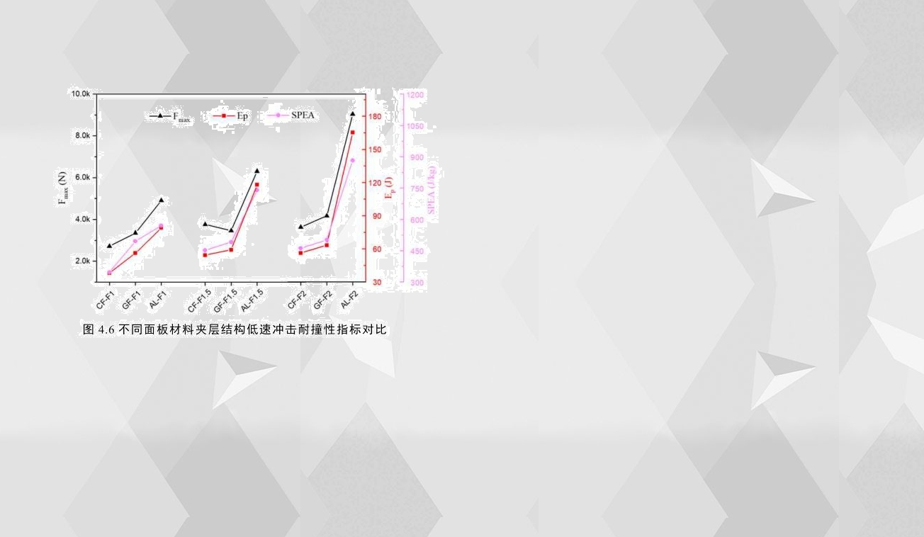 為了更為直觀地比較不同面板材料的夾層結構的抗沖擊性能,圖4.6比較了相同面板厚度但面板材料不同的夾層結構的耐撞性指標,通過比較可以看出,鋁合金夾層結構有最優的耐撞性能,其臨界穿透能高達118J,初始峰值載荷高達6297N;而碳纖維增強夾層結構的耐沖擊性能明顯低于鋁合金夾層結構的,其臨界穿透能和初始峰值載荷分別為54J和3752N;而與碳纖維增強夾層結構相比,玻璃纖維的耐碰撞性略有提高,其臨界穿透能為59J。此外,根據三者完全穿透試件的載荷-位移在第一階段的斜率可以看出,如圖4.5(d),鋁合金夾層結構的斜率最大,也就是說,在低速沖擊工況下,鋁合金夾層結構的剛度大于纖維增強夾層結構的剛度。通過觀察面板厚度為1mm和2mm試件的耐撞性指標,也可以知道,在低速沖擊工況下,鋁合金夾層結構有最好的耐撞性能,而碳纖維夾層結構的耐撞性能在三者幾乎是最差的。