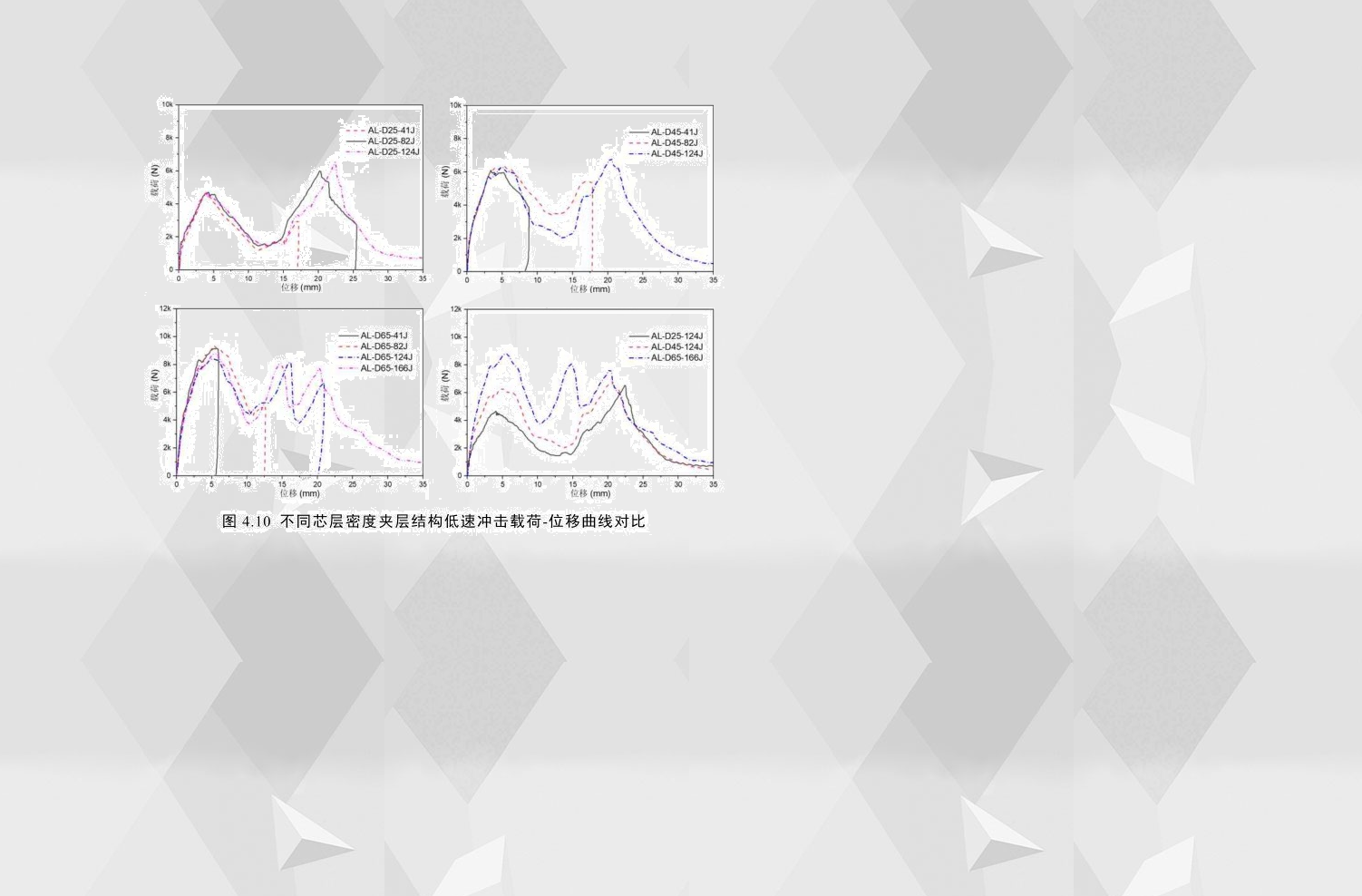 為了了解泡沫芯層對(duì)夾層結(jié)構(gòu)沖擊性能的影響,分別選擇了三種不同芯層密度和三種不同芯層高度的夾層結(jié)構(gòu)作為研究對(duì)象,需要特別說(shuō)明的是,這六種配置的試件,其面板均由厚度相同的鋁合金制成。圖4.10為相同配置夾層結(jié)構(gòu)在不同沖擊能量下及不同芯層密度的試件在穿透能下的載荷-位移曲線,通過(guò)對(duì)比可以看出,當(dāng)芯層密度從0.45g/cm3增加到0.65g/cm3時(shí),載荷-位移曲線的形式發(fā)生了很大變化,曲線的峰值載荷由兩個(gè)變?yōu)槿齻€(gè),且曲線的波峰和波谷均隨芯層密度的增加而增加。